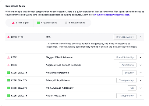 Protect your brand's reputation with in-depth publisher assessments. Get actionable quality and compliance insights into quality and compliance standards – no hidden data, just transparency you can trust.