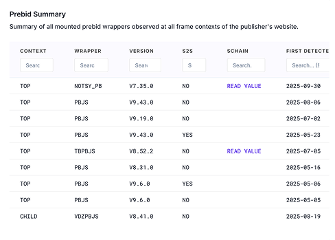 We meticulously track every small detail about ad auctions on page. Find detailed records on all prebid wrappers a publisher users, every module, and every ad unit. Find publishers a specific identification or analytics solution along with rich details with just a quick search.